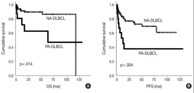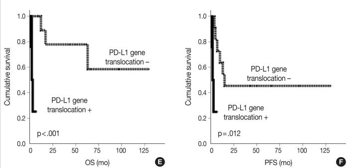Finally, the authors analyzed associations between the PD-L1 gene alterations and clinicopathological parameters and prognosis within the PA-DLBCL group. Among patients with PA-DLBCL, those with alterations in the gene for PD-L1 tended to have elevated serum LDH, presence of B symptoms, and less bulky disease, although these trends were nonsignificant (p = 0.119, p = 0.145, and p = 0.119, respectively). When survival was analyzed within the PA-DLBCL group, PD-L1 gene alterations as a whole did not significantly affect OS or PFS. However, further analysis revealed that, while PD-L1 gene amplification was not associated with prognosis, PD-L1 translocations contributed to a significantly inferior OS (p<0.001) and PFS (p = 0.012). Though the aggressive clinicopathologic nature of PA-DLBCL cannot be fully explained by PD-L1 gene alteration alone, as PD-L1 gene alteration was only identified in 39% of cases, this study demonstrates that PA-DLBCL has aggressive features with a high rate of PD-L1 gene alteration and poor prognosis. Further research is needed to elucidate the role of PD-L1 signaling in the pathogenesis of PA-DLBCL and the association between PD-L1 expression and aggressive disease.