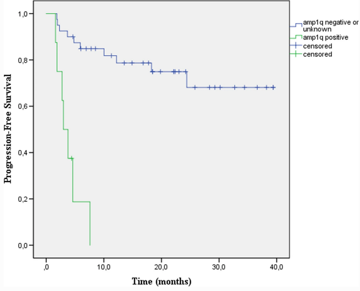 Seven 1q21+ patients received the daratumumab treatment at first relapse, while one 1q21+ patient received daratumumab treatment at second relapse. The presence of 1q21+ was verified using interphase fluorescent in situ hybridization, and all eight patients had ≥4 copies of 1q21. Median follow-up time was 10.1 months (3.0-17.7 months). Of these eight patients, only one achieved very good partial response; 7 patients discontinued treatment due to disease progression, and 4 of these patients have died. Median PFS was 3.0 months (1.6-7.6 months). In contrast, for 40 RRMM patients without amp1q who received daratumumab treatments at comparable disease stages during the same time period, the median PFS was not reached after a median follow-up for 18.4 months (2.3-39.4). These data suggest that 1q21+ patients respond very poorly to daratumumab treatment, and the authors propose that novel treatment options be considered for this MM patient subpopulation.