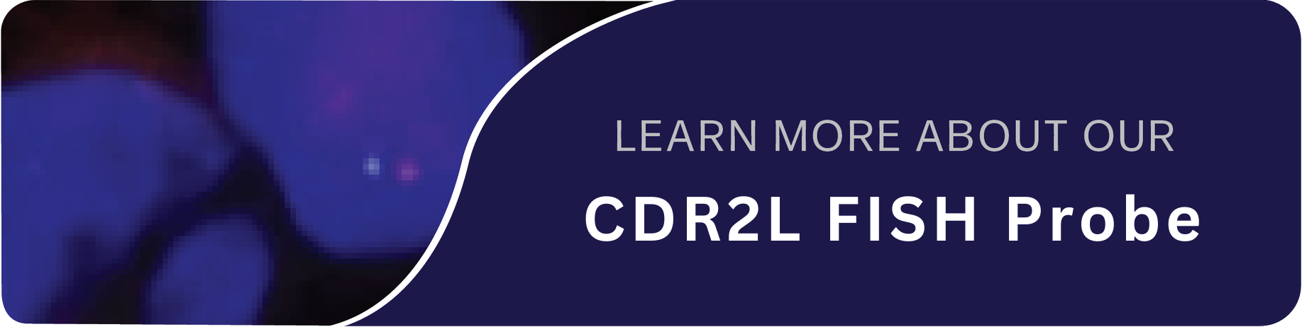 Mutational status and gene expression profiles of 22 samples from 17 Yo-PCD breast cancer patients were compared to a control group of 15 HER2+/HR- breast cancer patients without Yo-PCD from the Biopathology Department of Centre Léon Bérard. DNA and/or RNA sequencing detected somatic mutations in CDR2L or CDR2 in 62.5% of the Yo-PCD tissue samples; these mutations were not detected in the matched controls. Both comparative genomic hybridization assay and fluorescent in situ hybridization (FISH) were used to detect copy number variations in CDR2L, with amplification (≥6 copies of CDR2L) detected in 61.5% of Yo-PCD samples and only 6.6% of control samples (p < 0.0001). Every Yo-PCD patient had at least one alteration in CDR2L or CDR2. RNA sequencing also revealed statistically significant overexpression of CDR2L transcript in Yo-PCD breast cancers compared to controls, which was confirmed by IHC staining (p = 0.02). Thus, CDR2L alterations are frequent in Yo-BCD breast cancer and may interact with ERBB2 amplification to result in PCD pathology. However, while ERBB2 and CDR2L both are located on the same chromosomic region (17q21-25), analysis suggested that these amplifications were independent, and FISH ruled out a double-minute chromosome. Further research is needed to elucidate the relationship between these two proteins in Yo-PCD pathogenesis in breast cancers.