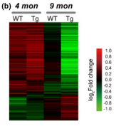 A transgenic mouse line was generated that expressed the Swedish mutation in amyloid precursor protein (APPswe) and a deletion in exon 9 of presenilin 1 (PSEN1). These mutations have been linked to increased Aβ production and early-onset AD, and mice with these mutations begin to develop vascular Aβ mutations at 6 months of age. So, to investigate the early impact of vascular Aβ deposits on the cerebral vasculome, the authors isolated cerebral endothelial cells from 4-month-old transgenic mice (with no obvious Aβ deposits) and from 9-month-old transgenic mice (with mild Aβ deposits). Endothelial cells from age-matched nontransgenic (WT) littermates were used as control. The transcriptome of each group was profiled using microarray. The gene expression patterns of 4-month-old transgenic mice (before Aβ deposits) were like those of age-matched WT mice, but by 9 months old (early disease stage), differential gene expression patterns were observed via heatmap. Notably, low density lipoprotein receptor-related protein 1 (LRP1), which is responsible for mediating Aβ clearance, showed significantly decreased expression in 9-month-old transgenic mice in comparison to WT control mice, indicating impaired Aβ clearance in transgenic mice brains. This result was confirmed by immunohistochemistry staining.