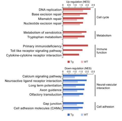 Functional enrichment analysis using GSEA identified that cerebrovascular Aβ deposition in transgenic mice was related with changes in endothelial functions. The authors note that similar functional alterations were observed during aging of the WT mice, but to a lesser extent than that seen in the transgenic mice. This suggests that CAA/AD progression in the vasculome may be related to an accelerated process of aging. Vascular Aβ deposition in transgenic mice was associated with the downregulation of the glutamate and GABA neurotransmitter receptors, as well as decreased calcium signaling. These changes could result in an impaired vascular capacity to sense neural activity and could impact vasodilation, resulting in a deficiency in cerebral blood flow and contributing to early CAA/AD pathology. Further, Aβ accumulation in transgenic mice was associated with decreased expression of cell adhesion molecules, which would disrupt neurovascular coupling; previous studies have linked neurovascular decoupling with the severity of CAA.