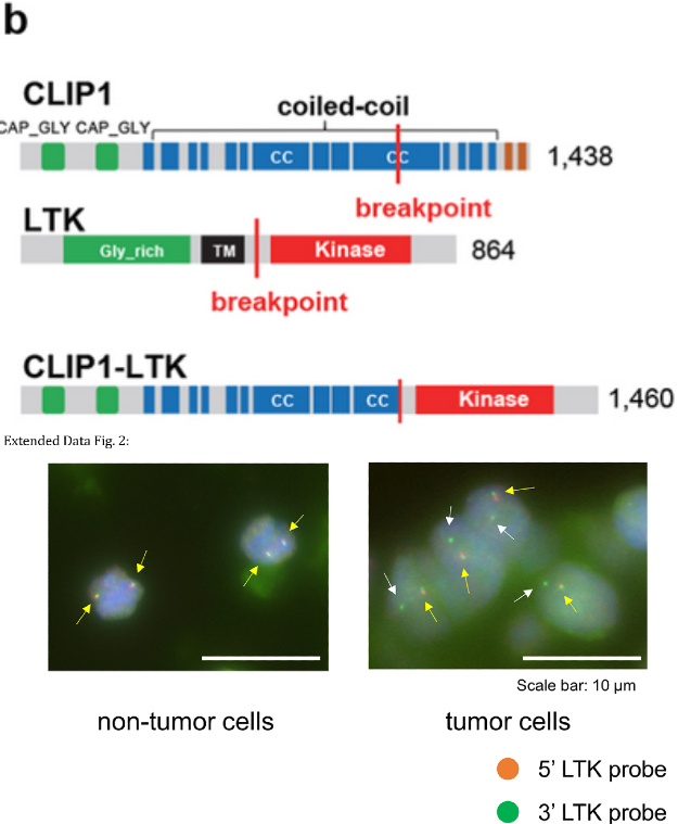 Non-small cell lung cancer (NSCLC) is the most common form of lung cancer and a leading cause of death worldwide. Fortunately, the survival rate for NSCLC patients has been increasing, largely due to advances in targeted molecular and immunotherapies. Somatic mutations and gene fusions that alter the receptor tyrosine kinase (RTK)/RAS/REF pathway are frequent treatment targets; these druggable oncogenic alterations include KRAS, EGFR, and BRAF mutations as well as ROS1, ALK, and RET fusions. However, 25-40% of NSCLC cases lack known actionable oncogenic mutations. In this study, the authors describe a novel oncogenic fusion of CLIP1 (CAP-Gly Domain Containing Linker Protein 1), located on 12q24, with LTK (Leukocyte receptor Tyrosine Kinase), located on 15q15. CLIP1 is a known fusion partner of other receptor tyrosine kinases, including ROS1, ALK, and RET. The LTK protein is grouped in the same receptor tyrosine kinase subfamily as ALK and can activate the RAS/MAPK and PI3K/AKT pathways but had not been definitively linked to oncogenesis. Here, the authors present the first evidence of a functional oncogenic alteration in LTK in cancer. Importantly, they also demonstrate that the CLIP1-LTK fusion is an actionable drug target for NSCLC patients that lack other known lung cancer biomarkers.