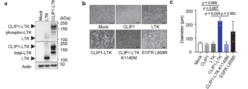 To test whether the CLIP1-LTK fusion protein could activate LTK kinase and drive cellular transformation, NIH3T3 cells were transiently infected with either CLIP1-LTK, wild-type (WT) LTK, or Mock control expression constructs. Western blot analysis detected greater LTK phosphorylation in CLIP1-LTK cells than in WT LTK cells. Both NIH3T3 fibroblasts and Ba/F3 pro-B murine cell lines were transduced with MIGR1 retroviral constructs to analyze transforming potential; cell lines were created to express either human CLIP1, LTK, CLIP1-LTK, CLIP1-LTK-K1140M (a kinase-dead control harboring a K1140M mutation), or Mock control. Again, LTK phosphorylation was observed in CLIP1-LTK cell lines but not in Mock cells, LTK cells, or CLIP1-LTK-K1140M cells, as measured by Western blot. Further, CLIP1-LTK cells showed a round-shape morphology, lack of contact-inhibition, and significantly larger colonies than control. CLIP1-LTK cells even showed larger colonies than positive control cells expressing EGFR-L858R, which has known transforming capacity, although this difference was not statistically significant. The transforming ability of CLIP1-LTK was also confirmed in vivo by subcutaneously injecting the NIH3T3 cell lines into the flank of nude mice. Tumors were only observed in nude mice injected with the CLIP1-LTK cell line. Together, these results suggest that the CLIP1-LTK fusion protein can drive malignant transformation both in vitro and in vivo, dependent on the constitutive activation of LTK kinase.