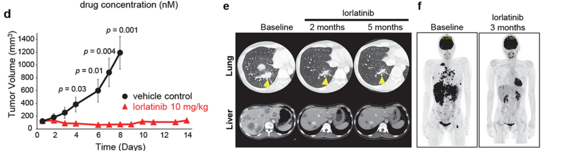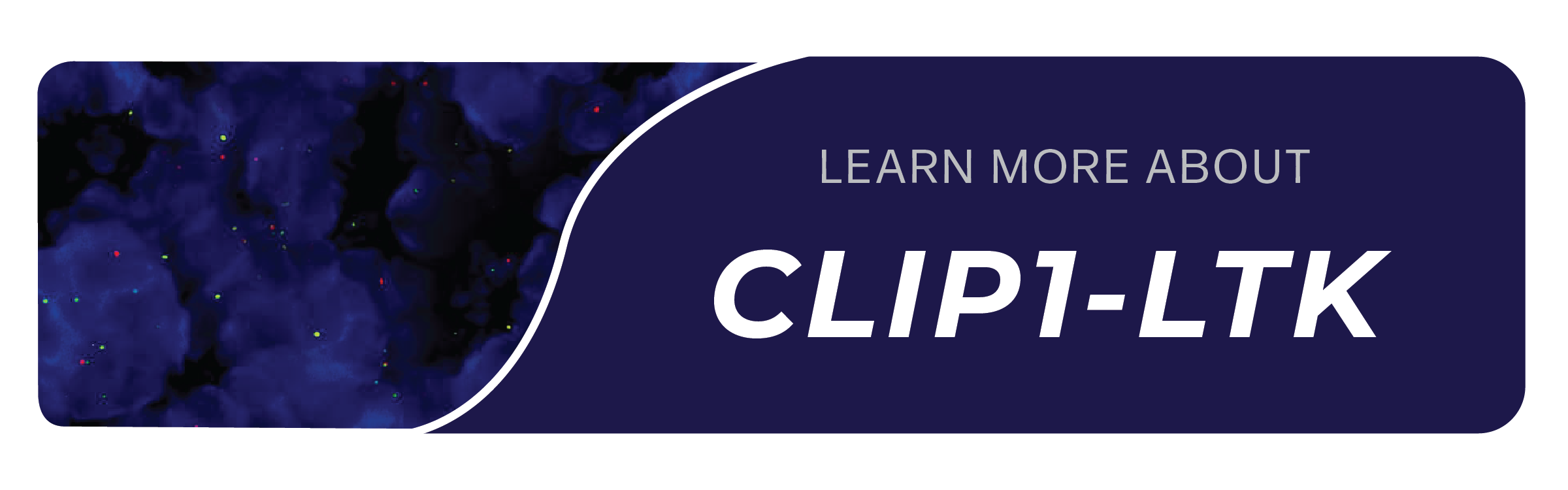The kinase domain of LTK shares nearly 80% identity to the kinase domain of ALK; given this large degree of homology, the authors hypothesized that ALK tyrosine kinase inhibitors (TKIs) may inhibit the activity of the CLIP1-LTK fusion protein. To test this hypothesis, the NIH3T3-CLIP1-LTK cell lines were treated with varying concentrations of these TKIs. Western blot analysis showed 10nM lorlatinib to be most effective at blocking CLIP1-LTK phosphorylation. In a cell viability assay, the IC50 of lorlatinib was 1.1 nM; the IC50 of other ALK inhibitors were in the 10-20 nM range, and the IC50 of Osimertinib, an EGFR TKI, was >100 nM. Decreased phosphorylation of downstream targets AKT and ERK was observed after a 24-hour treatment with lorlatinib compared to untreated controls; apoptotic markers were also observed. Consistent with these in vitro results, mice that received lorlatinib treatment after having been injected with CLIP1-LTK cells showed significantly inhibited tumor growth compared to controls. The CLIP1-LTK index patient was approved to receive lorlatinib off-label and two- and five-month follow-up CT images show a dramatic clinical response, with shrinkage of both the primary tumor and metastatic tumors. The duration of this response is unknown, and certainly would need to be corroborated by larger clinical studies, yet still warrants an investigation of repurposing available drugs as well as the development of more specific LTK inhibitors. While a larger retrospective screening (n=1,500) for the CLIP1-LTK fusion using the LC-SCRUM-Asia cohort is underway, a preliminary analysis of 542 NSCLC samples identified the alteration in 0.4% (3/542) of samples. Though rare, all 3 patient samples with CLIP1-LTK fusion lacked any other known oncogenic driver, suggesting that CLIP1-LTK is a mutually exclusive driver of lung tumorigenesis. This is also noteworthy in that these patients did not previously have a targeted treatment option available to them. If this cohort is representative of the worldwide population of lung cancer patients, it is predicted that there are more than 7,500 patients with NSCLC who harbor the CLIP1-LTK fusion and may benefit from treatment with lorlatinib, even before the development of selective LTK inhibitors. As NGS panels are developed to detect CLIP1-LTK, FISH can be used to identify patients with this novel oncogenic fusion for treatment.