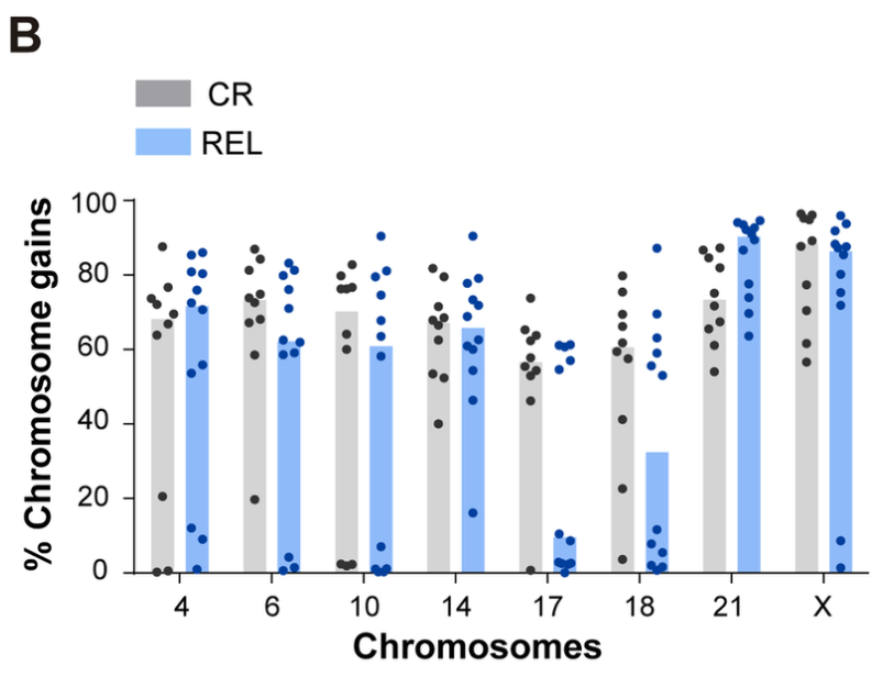 Bone marrow samples from HHD-B-ALL pediatric patients were obtained at disease presentation from collaborating hospitals. Among these diagnosis samples (DX, n=22) were samples from patients who remained alive in complete remission after a minimum 5-year follow up (CR, n=10) and patients who relapsed within this timeframe (REL, n=12). Sequential FISH (seq-iFISH) analyses were performed to assess the presence of the 8 chromosomes typically gained in HHD-B-ALL (chromosomes X, 4, 6, 10, 14, 17, 18 and 21). There was no difference in the total number of chromosomal gains observed in CR versus REL patients. However, there were observed differences in rates of specific chromosomal gains between these two groups. Samples from CR patients had increased rates of gain of chromosomes 17, 18, 6, and 10, whereas samples from REL patients had increased rates of chromosome 21.