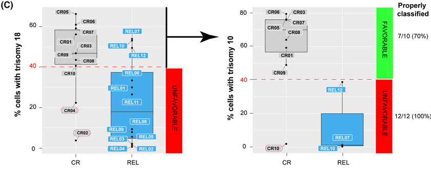 Next, computational modeling using a Random Forest decision tree-based approach examined whether specific combinations of chromosomal gains in DX samples could distinguish patients in CR vs. REL. The most stable and accurate computationally-defined risk predictor was based on chromosomes 18 and 10 trisomy rates. This risk-predictor correctly classified DX patients as CR or REL with 70% and 100% accuracy, respectively. In a blind validation test using a larger independent cohort of HHD-B-ALL samples from 50 patients, this risk-predictor correctly classified 84% (42/50) of patients as either disease-free or relapsed. To verify the prognostic value of their findings, the authors statistically analyzed the effects of age, gender, WBCs, minimal residual disease (MRD) status, treatment protocol and the risk-predictor based on trisomies 18 and 10 on patient outcome in their validation cohort. The risk-predictor based on low levels of trisomies 18 and 10 was the only independent risk factor associated with higher REL rates (p<0.001). Patients with a favorable risk predictor (+18+10>40%) had a higher rate of relapse-free survival than patients with an unfavorable risk predictor (p<0.0001).