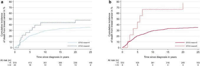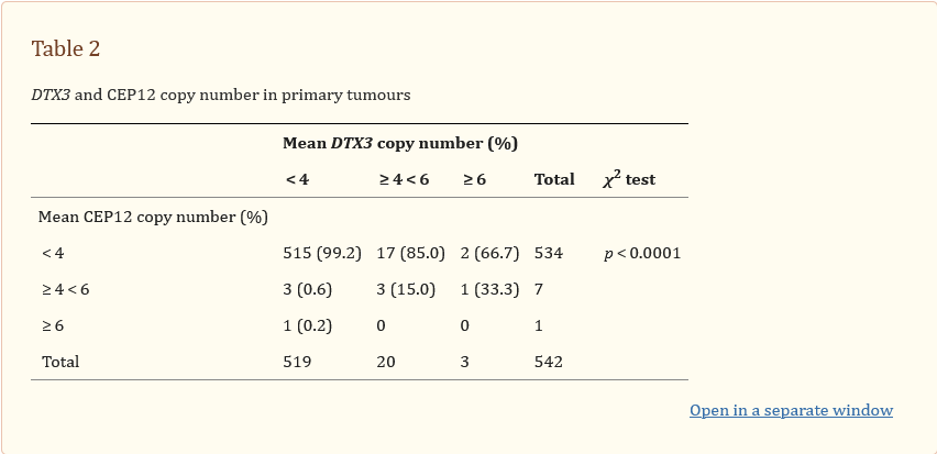 Due to the fact that only three cases had mean DTX3 copy number ≥6, the authors reclassified cases for further statistical analysis. Point estimates suggested that cases with DTX3 amplification had higher proliferation, higher histologic grade and a poorer prognosis than cases without DTX3 amplification, but the statistical significance of the association depended on the choice of cut-off. For example, with regards to proliferation, a statistically significant association between DTX3 amplification and Ki67 level was only found using the <4 / ≥4 cut-off (p=0.03) whereases a statistically significant association between DTX3 copy number and mitotic counts was found using both the <4 / ≥ 4 < 6 / ≥ 6 cutoff (p=0.03) and the <4 / ≥4 cut-off (p=0.009) but not the <5 / ≥5 cutoff (p=0.3). An association between DTX3 copy number and histological grade was found using both the <4 / ≥ 4 < 6 / ≥ 6 cutoff and the <4 / ≥4 cutoff (both p<0.001), with tumors with DTX3 amplification being of higher histological grade. Finally, death from breast cancer was higher among cases with mean DTX3 copy number ≥5 versus mean <5 (p=0.003); this statistical significance was not seen using the <4/ ≥4 cut-off (p=0.17).