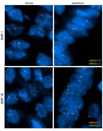 Cases were selected from patients ≥50 years old who received a hysterectomy at the UT Southwestern Clements University Hospital between 2010 and 2020. Cases with a concurrent or prior diagnosis of AH/EIN or any uterine malignancy were excluded, and all cases were reviewed to confirm the presence of an EMP and absence of a uterine malignancy or premalignancy. Adjacent normal tissue removed during the hysterectomy, such as ovary or cervix, was used as control (i.e., “germline”) DNA during NGS analysis. DNA and RNA sequence analyses were conducted to detect single nucleotide variants, indels, and gene fusions for over 1500 cancer-related genes across human malignancies, not just those specific to endometrial or gynecologic malignancies. Only one gene fusion of indeterminate biological significance was detected in one case (MYH9::SNHG16, chromosomes 22:17). There were no gene fusions detected that were likely to represent EMP drivers. Of note, the authors did not detect any gene fusions involving chromosome 6p as had been reported in earlier studies of EMPs conducted in the 1990s. This result was confirmed via break-apart fluorescent in situ hybridization (FISH) assays for the HMGA1 and HMGA2 genes that were performed on a subset of 16 EMPs. These two genes were identified as targets of rearrangements in two earlier studies but were not shown to be rearranged via NGS or FISH in this study. As the 1990s studies used karyotyping to detect these chromosomal rearrangements, those early reports could represent tissue culture artifacts.