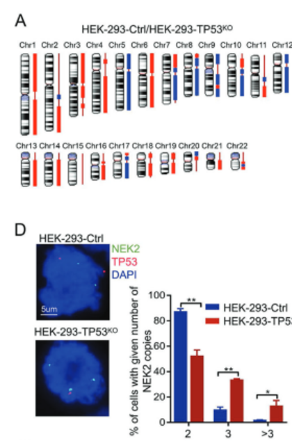 To establish a causal link between TP53 deletion and NEK2 overactivation, p53 expression was induced using different concentrations of nutlin-3a in TP53 WT and TP53-/- MM cell lines. Nutlin-3a inhibits MDM2-p53 interactions, stabilizing and activating the wild-type p53 protein. As nutlin-3a concentrations increased, TP53 mRNA and protein levels increased (p < 0.01) and NEK2 mRNA and protein levels decreased (p < 0.01), but only in the TP53 WT cell lines; without a wild-type copy of TP53, there was no functional p53 protein to be stabilized by nutlin-3a, so there was no effect of increasing nutlin-3a concentrations on NEK2 protein and mRNA levels. This suggests that WT p53 activity directly impacts NEK2 expression, and hints at a causal relationship. Knocking out TP53 using CRISPR-Cas9 editing triggered a dramatic increase in NEK2 mRNA and protein levels, and subsequent restoration of WT TP53 expression resulted in a decrease in NEK2 mRNA and protein levels. Thus, the data suggest that NEK2 expression is inversely related to TP53 activation in a cause-and-effect manner. In addition, using a comparative genomic hybridization (CGH) array, the authors determined that TP53-knockout HEK293 cells were especially prone to chromosomal instability, including deletion of chromosomes 5, 7q, 8, 9, and 17p and gains of chromosomes 1, 2q, 3p, 4p, 6, 13q, and 14q. Of note, chromosome 1q21-44, where NEK2 is located, was dramatically amplified; FISH confirmed that the number of cells with 3 and >3 copies of NEK2 significantly increased in the TP53 knockout cells (p < 0.01 and p < 0.05, respectively). Taken together, the data suggest that loss of TP53 leads to NEK2 amplification and overexpression in MM.