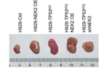 The final task was to determine if dual defects in TP53 and NEK2 result in a synergistic effect promoting MM development. To this end, NEK2 was overexpressed in H929-TP53 WT cells and in H929-TP53KO cells. Cells with dual defects in NEK2 and TP53 were most proliferative as determined by both clonogenic soft agar assay and BrdU intake assay. When these cell lines were injected subcutaneously into the abdomen of mice, the most dramatic tumor growth was seen in the dual defect group. As the authors previously found NEK2 overexpression to contribute to drug resistance in MM patients, they used an apoptosis assay to test the sensitivity of cell lines with dual defects to Bortezomib (BTZ), a first-line MM treatment. The percentage of apoptotic cells was lowest in the dual defects group (67.2%) after BTZ treatment when compared to control (96%). It was possible to reverse the proliferative, tumorigenic, and drug-resistant capacity of these cells with expression of wild type p53 in MM cell lines, and this reversal was even more substantial when combined with NEK2 depletion. These results show that dual defects in NEK2 and TP53 can have a significant clinical impact on MM patients and suggest the possibility of developing selective NEK2 inhibitors to improve therapeutic outcomes.