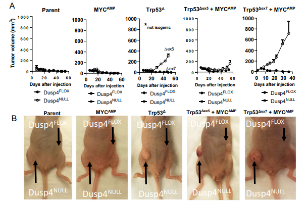 The derivative cell lines were orthotopically implanted in opposing #5 mammary fat pads of athymic nu/nu mice. The combined loss of Dusp4 and Trp53 led to the largest increase in tumor volume, and this trend was observed regardless of MYC amplification, although the most aggressive cell line also harbored MYC gains. Though the most robust tumorigenic response was seen from Dusp4-deficient lines, one cell line with competent Dusp4 produced tumors; this cell line had p53 loss of function and MYC amplification, and the tumors produced were smaller and less aggressive than cell lines that were Dusp4-deficient. However, further investigations also suggested that Dusp4 loss was not directly impacting tumorigenesis. For example, when Dusp4 was abruptly deleted from Dusp4-competant Trp53∆ + MYCAMP cells just one week prior to injection into the host mice, no tumor growth was observed. Similarly, lentiviral reconstitution of human DUSP4 into Dusp4-deficient Trp53∆+ MYCAMP cells did not suppress tumor formation. Thus, the data suggest that the tumor-forming potential was not resulting from canonical Dusp4 function in MAPK signaling. Rather, as Dusp4 is also involved in G1/S checkpoint control, Dusp4 loss accompanied by loss of p53 function could result in genomic instability that helps to generate or select for the emergence of tumorigenic clones. Indeed, Dusp4 loss was associated with multinucleation in their cell lines, which the authors infer could be due to replication stress, and which could lead to genomic instability in the form of chromosome mis-segregation and copy number variations.