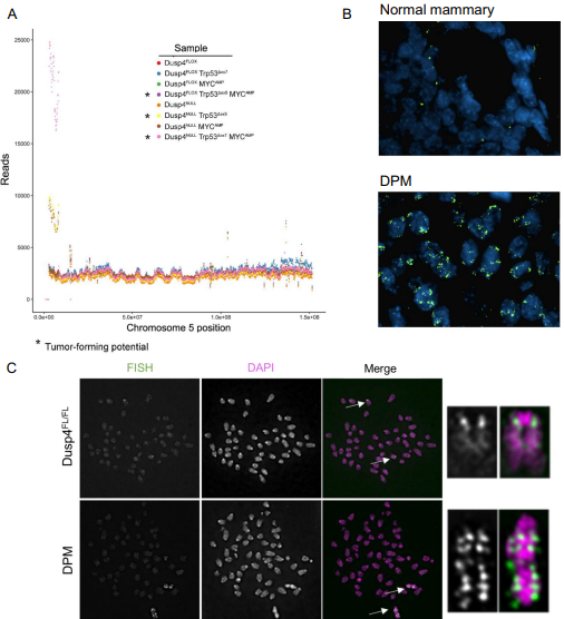 Whole-genome sequencing revealed an amplicon on murine chromosome 5 in all Dusp4-deficient lines, as well as in the Dusp4-competent Trp53∆+ MYCAMP cell line that formed small, slow-growing tumors. Because the amplicon was found in all tumor-forming lines, including one Dusp4-competent line, the authors hypothesize that Dusp4 loss is not required to generate this amplicon, but may select for it or facilitate its formation. The amplicon was located near the chromosome 5 centromere and contained the genes Dbf4, Cdk6, and Cdk14, which are all associated with cell cycle regulation. Fluorescent in situ hybridization confirmed amplification of this region in the Dusp4-deficient Trp53∆+ MYCAMP cell line, and metaphase spreads showed tandem duplications of the region throughout chromosome 5, suggesting repeated chromosome mis-segregation. When Dbf4 was silenced in the Dusp4-deficient Trp53∆+ MYCAMP cell line, and the resulting cells were orthotopically implanted into athymic nu/nu mice, the tumor-forming capacity of these cells, which had been aggressive in earlier trials, was greatly suppressed. Thus, one possible mechanism of BLBC tumorigenesis is emerging; loss of DUSP4, combined with loss of p53 function and potentiated by MYC overexpression, results in cells that acquire DBF4 amplification through genomic instability and selective pressure; the action of DBF4, which can rescue stalled DNA replication forks and initiate DNA replication, allows cells to escape cell cycle checkpoints and triggers tumorigenesis. Further studies will be needed to confirm and expound upon this proposed novel oncogenic mechanism in BLBCs.
