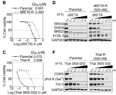 First, the authors continuously exposed an ovarian cancer cell line (A1847) and a breast cancer cell line (SUM159) to PROTACs in increasing concentrations; the ovarian cancer cells were exposed to either a bromodomain degrader (dBET6-R) or cyclin-dependent kinase 9 degrader (Thal-R), while the breast cancer cells were exposed to a bromodomain degrader (MZ1-R). The cells that were chronically exposed to PROTACs were more resistant to the effects of these drugs, as demonstrated by a rightward shift in dose-response viability curves compared to parental control cells. Liquid chromatography with tandem mass spectrometry (LC-MS/MS) revealed that treating the chronically exposed cells with increasing PROTAC concentrations was insufficient to degrade the target protein to the extent observed in the parent cells; the drug concentration required to degrade 50% of the target protein (DC50) was much higher for the chronically exposed cells, in some cases even 1000x higher. Thus, these cells had developed PROTAC resistance.