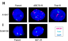 To explore the mechanism behind this PROTAC resistance, the authors investigated the top 10 upregulated proteins in the resistant cell lines. They found that MDR1 protein levels were upregulated by 2.5-5x relative to the parental control lines. A rhodamine 123 efflux assay suggested that this increase in MDR1 protein levels also resulted in an increase in efflux activity in these drug-resistant cells, limiting PROTAC accumulation and reducing the degradation of the target protein. The gene that encodes the MDR1 drug efflux protein, ABCB1, is frequently amplified in chemotherapy-resistant cells, and so fluorescent in situ hybridization (FISH) was used to determine if gene amplification of ABCB1 contributed to the development of PROTAC resistance as well. The drug-resistant ovarian cancer cell line showed significant gene amplification of ABCB1, with a mean of 12 ABC1 copies per nucleus in the Thal-R treatment cells and a mean of 30 ABCB1 copies per nucleus in the dBET6-R treatment cells, compared to only 3-4 centromere control probes per nucleus. In contrast, the drug-resistant breast cancer cells generally had four copies of ABCB1, each signal appearing near a centromere control, which suggests that the copy number increase was due to polysomy rather than amplification in this cell line. As epigenetic mechanisms could also result in an increase in MDR1 expression, the authors examined methylation of the ABCB1 promoter using CpG bisulfate amplicon sequencing. Decreased methylation of the ABCB1 promoter was observed in the ovarian cancer cell line but not in the breast cancer cell line. The authors concluded that ABCB1 amplification and/or decreased methylation of the ABCB1 promoter results in increased MDR1 activity in the PROTAC-resistant ovarian cancer cells, but could not draw conclusions about the mechanism of increased MDR1 activity in the PROTAC-resistant breast cancer cells.
