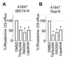 Having linked PROTAC resistance to MDR1 activity, the authors next investigated whether this resistance could be overcome. First, knockdown of ABCB1 reduced cell viability in both the drug-resistant ovarian cancer cell lines and drug-resistant breast cancer cell line, but not in the parental cell line. As the resistant cells were continuously exposed to PROTACs, this result suggests that the ABCB1 knockdown allowed for the accumulation of PROTACs within the cell, restoring the degradation of target proteins and resulting in cell death. Similarly, MDR1 blockade using tariquidar was effective in reducing activity of the MDR1 efflux pump, as measured by the reduced efflux of rhodamine 123; coadministration of tariquidar also increased target protein degradation and inhibited cell viability in the drug-resistant cell lines. However, tariquidar has shown limited clinical success due to toxicities, low drug-drug interactions, and the inability to achieve desired concentrations of tariquidar in tumors; so, the authors next tested the effect of lapatinib, an ErbB receptor inhibitor that is currently FDA-approved for the treatment of HER2-driven cancers, and has also been shown to inhibit MDR1 drug efflux activity, in the PROTAC-resistant cell lines. The lapatinib treatment similarly reduced MDR1 drug efflux activity, resulted in the degradation of the target protein, and caused cell death. Therefore, lapatinib is effective in creating MDR1 blockade to overcome cellular resistance to PROTACs. Clinical trials should explore combining PROTAC treatment with lapatinib for a more durable treatment response.