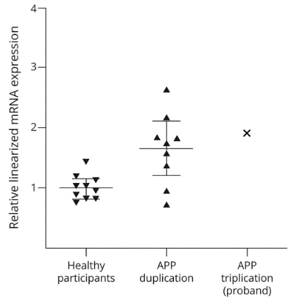 To determine if the gene triplication resulted in overexpression of the APP gene, the proband’s mRNA APP levels were assessed using reverse-transcription-digital droplet PCR. Compared with 10 normal controls, the proband showed a twofold increase in relative APP mRNA levels. This increase in APP mRNA would lead to APP overproduction, resulting in severe Aβ deposits. Indeed, cerebral biopsy of the proband’s father showed significant amyloid perivascular deposits. Nine patients with APP duplication showed a median of 1.8-fold increase in APP mRNA levels relative to controls. Further research will be necessary to determine if APP triplications result in significantly increased mRNA levels than duplications and what, if any, effects this increased expression has on disease presentation or age at onset.