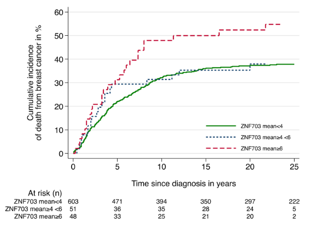 ZNF703 amplification was found within all molecular subtypes but was most strongly associated with the Luminal B subtype (p < 0.001). High ZNF703 copy number was also associated with measures of increased proliferation including Ki ≥ 15% (p < 0.01) and high mitotic counts (p < 0.01). After ten years of follow up, patients with ZNF703 copy number ≥6 had a hgher cumulative risk of death from breast cancer than patients with ZNF703 copy number <4 (48% vs. 32%, respectively; p = 0.04). This result was consistent even when adjustments were made for age, stage, grade, Ki67 and HER2 status.
