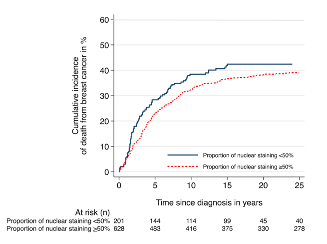 The authors also used immunohistochemistry (IHC) to quantify expression of ZNF703 and investigate potential links between ZNF703 copy number and protein expression, as well as ZNF703 protein levels and prognosis. The proportion of tumor cells with nuclear ZNF703 immunostaining was assessed by two pathologists and cases were then divided into two groups (ZNF703 <50% and ZNF703 ≥50%). Positive nuclear staining (≥50%) was seen in all molecular subtypes, but was most frequent among the luminal subtypes, with the highest proportion seen among Luminal B tumors (p < 0.001). There was a significant association between increased ZNF703 copy number and positive IHC staining (p < 0.01). However, despite the earlier association between ZNF703 copy number and poor prognosis, and the association between ZNF703 copy number and positive IHC staining, there was no significant association between positive ZNF703 IHC staining and prognosis (p=0.2). The authors noted that the proportion of tumors with positive IHC staining was much higher than the proportion of cases with ZNF703 copy number increase. Further study will be needed to elucidate the relationship between ZNF703 amplification, ZNF703 protein levels, and prognosis.