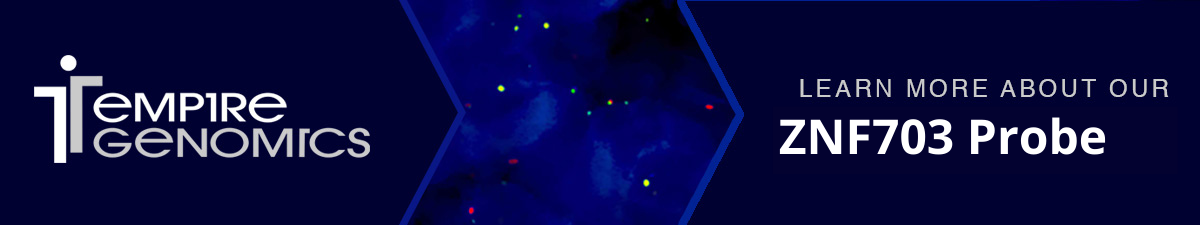 Among patients with breast cancer, luminal subtypes are the most common. Differences in prognosis have been demonstrated between the luminal subtypes, ranging from patients with an excellent prognosis to those who require much more aggressive treatment. Thus, the identification of new prognostic biomarkers and potential treatment targets within this large subgroup of breast cancer patients is of clinical importance. In this study, the authors used fluorescence in situ hybridization (FISH) to investigate the frequency of the Zinc finger protein 703 gene (ZNF703) in a cohort of women with breast cancer. ZNF703 is located on 8p12 and is part of the A1 amplicon. It has been identified as the most likely driver gene in the A1 amplicon due to its role in estrogen receptor (ER) signaling and cell cycle progression. Overexpression of ZNF703 is associated with increased proliferation in breast cancer, reduced survival in luminal tumors, and reduced response to endocrine therapy in ER positive breast.